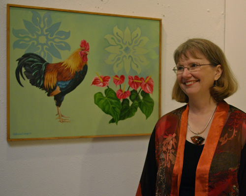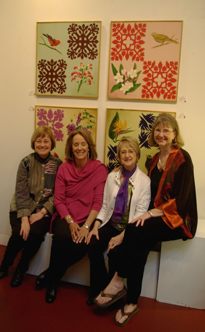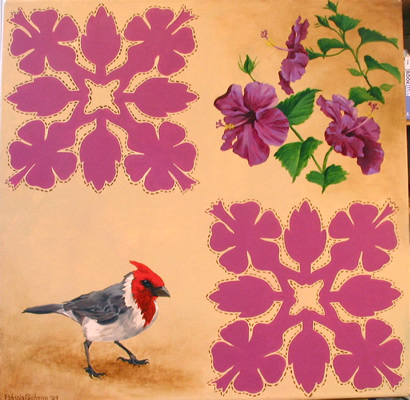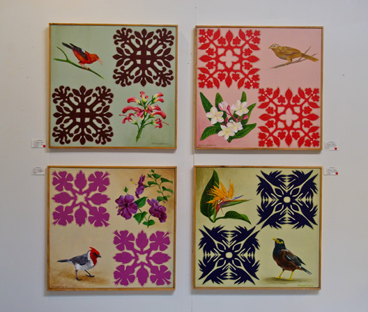 In March 2010, Pat was the Featured Artist at the River Gallery. Her show was inspired by the Hawaiian floral quilt patterns and their corresponding flowers. She teamed these images with Hawaiian birds such that each canvas became part of a larger pattern, in the same way each block of a quilt added to the overall composition.